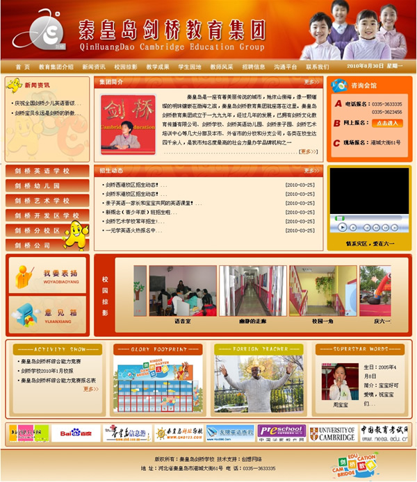 秦皇島是一座有著美麗傳說(shuō)的城市,她依山傍海,像一顆璀璨的明珠鑲嵌在渤海之濱,秦皇島劍橋教育集團(tuán)就座落在這里。秦皇島劍橋教育集團(tuán)成立于一九九九年,經(jīng)過幾年的發(fā)展,已擁有劍橋文化教育傳播有限公司、劍橋?qū)W校、劍橋英語(yǔ)幼兒園、劍橋親子園、劍橋藝術(shù)培訓(xùn)中心等幾大分部及本市、外省市的分校和分支公司,各類在校生達(dá)四千余人,是我市知名度高的社會(huì)力量辦學(xué)品牌機(jī)構(gòu)之一 。